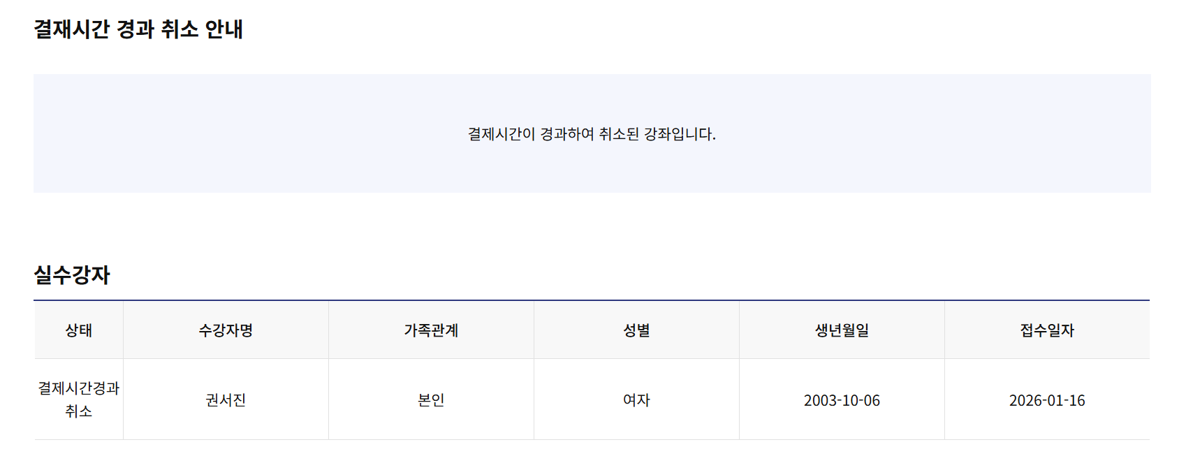 안녕하세요 마포365구민센터 요가 월수금 8시 재등록을 하려고 하는데, 결제 시간 경과 취소가 되었다고만 뜨고 재등록 버튼이 사라졌는데, 재등록 하려면 어떻게 해야하나요? 참고로 제가 실제로 결제를 한참 뒤 시도한 것도 아니고, 바로 결제하려고 하였는데도 결제 시간 경과 취소라고 떴습니다!