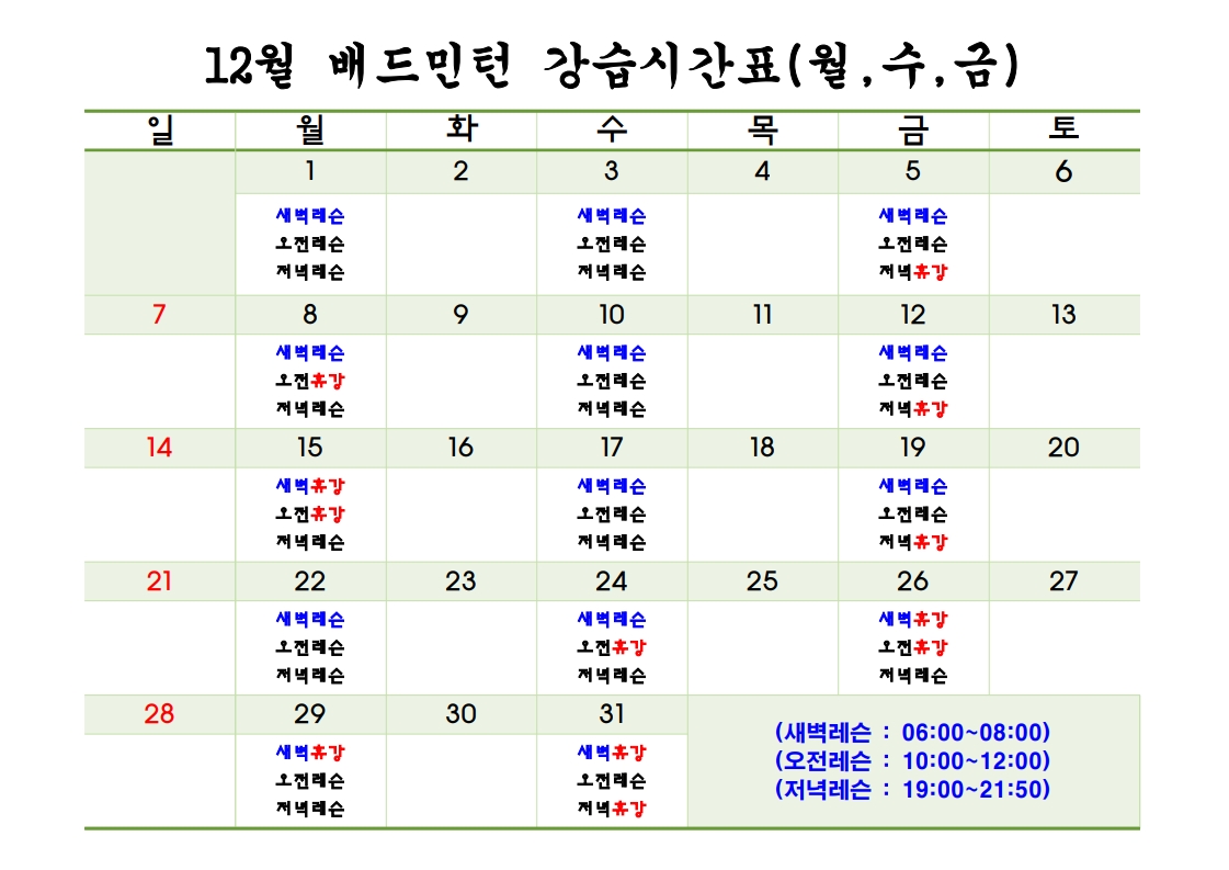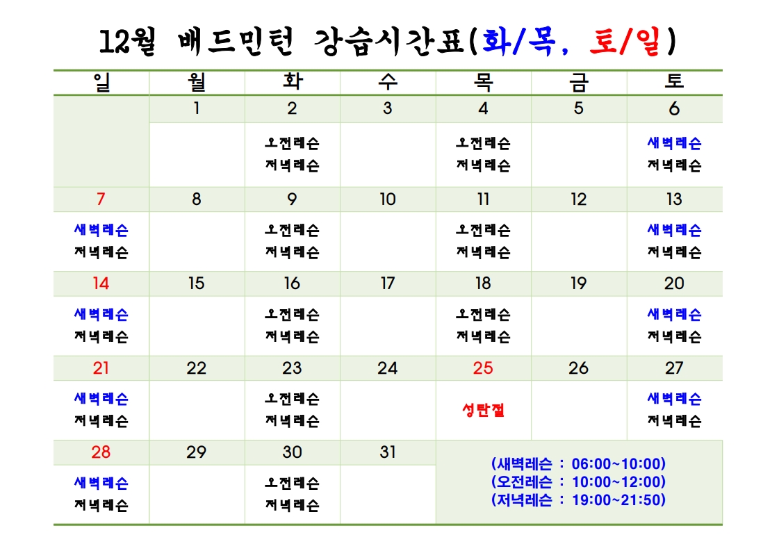 [성미산체육관] 12월 배드민턴 레슨 시간표(휴강안내) - 수정